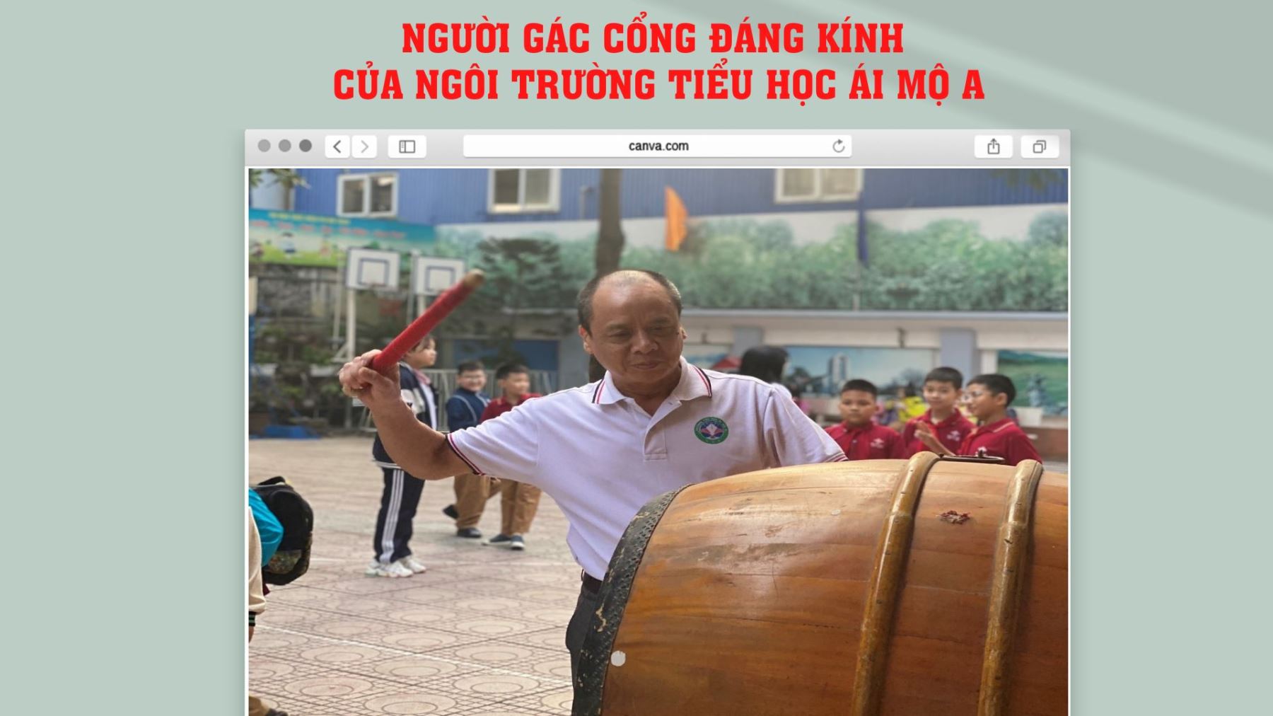 Hình ảnh bác Tạ Văn Luận đánh trống báo học sinh vào lớp truy bài