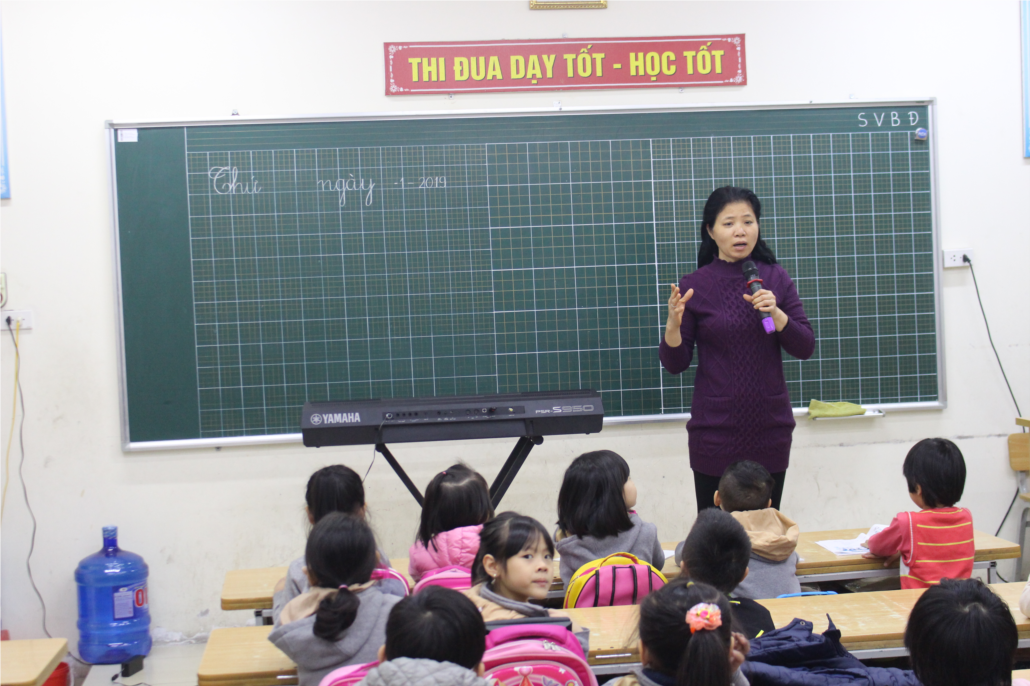 Cô Đào Thị Thu Huyền trong một tiết dạy âm nhạc cho các con học sinh