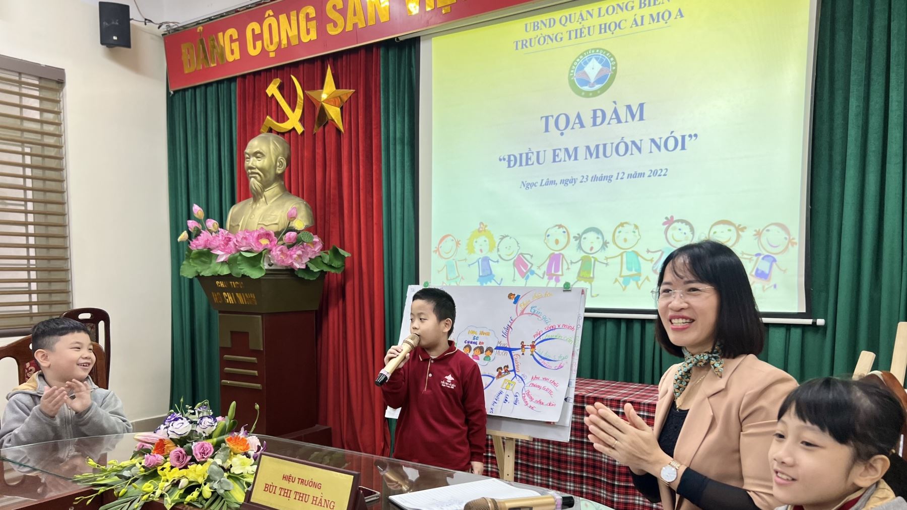 Sau thời gian làm việc cởi mở, chân thành, buổi tọa đàm “Điều em muốn nói” của thầy cô trong Ban Giám Hiệu với các em học sinh đã đạt được những kết quả tốt đẹp. Đây là tín hiệu rất đáng mừng thể hiện rõ mong muốn của lãnh đạo nhà trường cũng như các em học sinh cùng hướng tới xây dựng trường Tiểu học Ái Mộ A là một ngôi trường hạnh phúc.