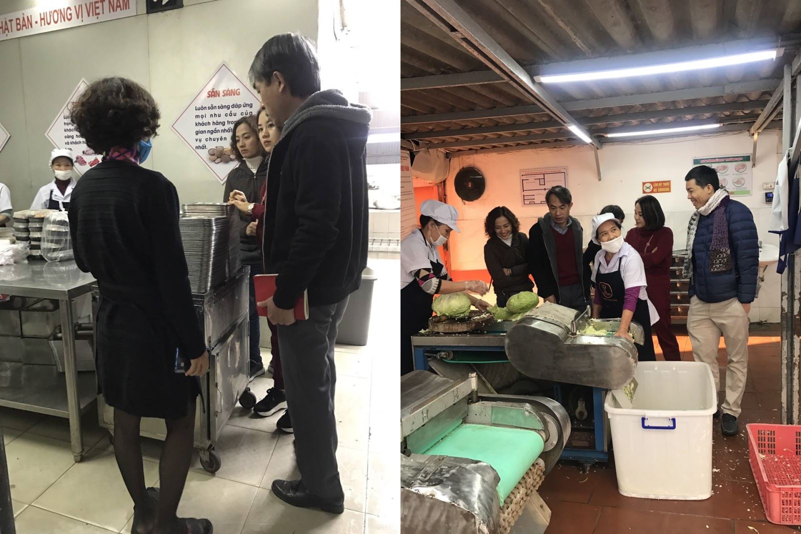 Các thành viên trong ban đại diện CMHS nhà trường đã giám sát việc chấp hành các quy định của pháp luật về bảo đảm an toàn vệ sinh thực phẩm tại thời điểm bếp đang chế biến thực phẩm tươi sống phục vụ cho bữa ăn ngày thứ năm 12/12/2019. Nội dung giám sát bao gồm: công tác thực hiện quy chế đảm bảo vệ sinh an toàn thực phẩm, bếp ăn một chiều; các điều kiện về bếp ăn, vệ sinh đồ dùng dụng cụ nhà bếp…. và vệ sinh môi trường xung quanh nơi công ty thực hiện nấu ăn. Tại thời điểm thăm quan, nhân viên của công ty đang chế biến thức ăn cho học sinh theo thực đơn ăn ngày thứ năm 12/12, thức ăn gồm rau bắp cải xào, canh chua nấu thịt, giò rim tiêu, trứng đúc thịt.
