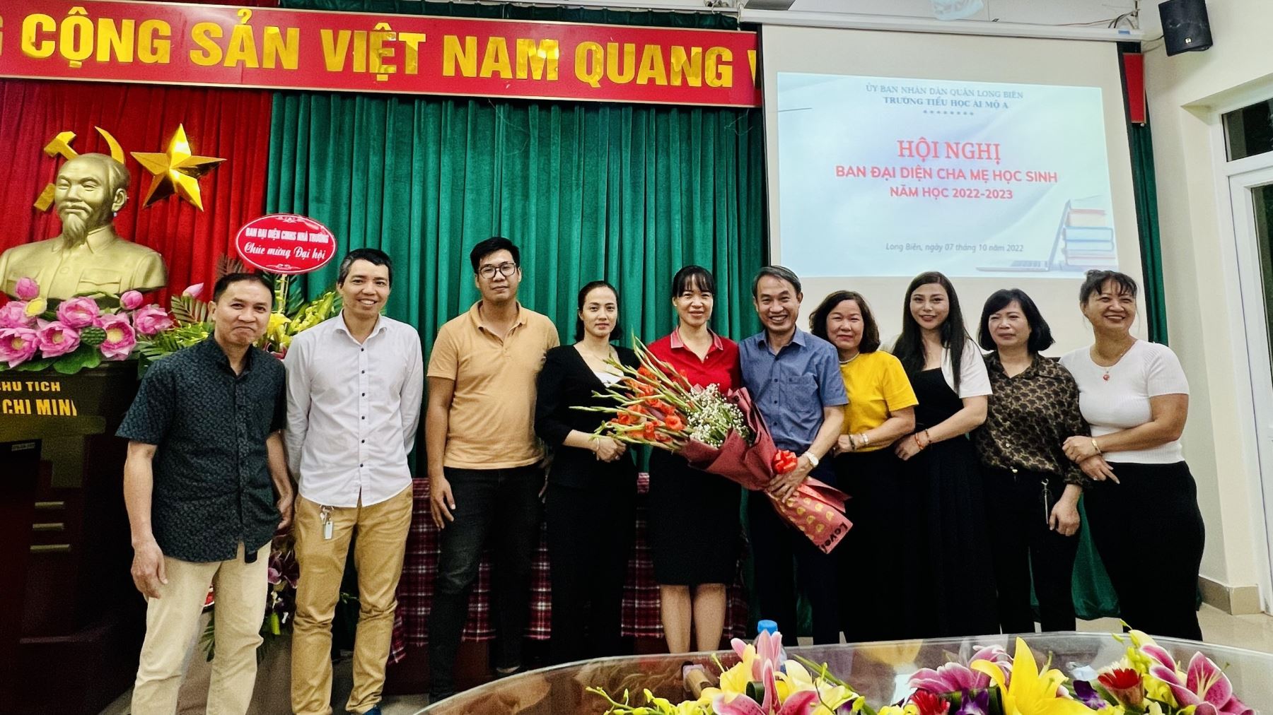Tiếp theo chương trình là phần bầu ban đại diện CMHS nhà trường năm học mới. Được sự nhất trí của Hội nghị đã bầu được 11 phụ huynh vào ban đại diện CMHS nhà trường. Bác Nguyễn Tiến Dũng tiếp tục là trưởng ban đại diện CMHS năm học 2022-2023. Ban phụ huynh mới ra mắt trong tiếng vỗ tay và niềm vui hân hoan của toàn thể đại biểu tham dự Hội nghị. Sau hơn một giờ đồng hồ, Hội nghị đã thành công tốt đẹp và nhận được sự thống nhất cao của các vị phụ huynh đại diện cho 22 lớp tham dự. Các Trưởng ban sẽ tiếp tục công việc cụ thể về các lớp trong bưổi sáng ngày 9/10/2022.