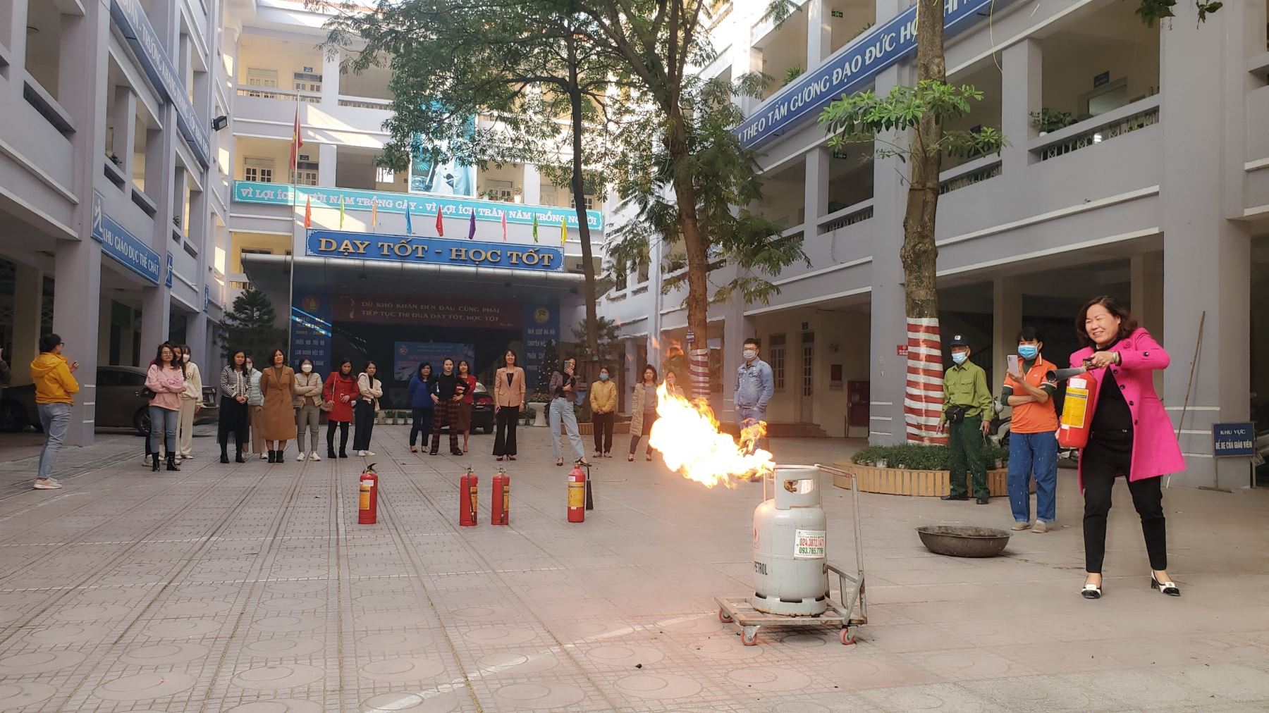 Sau phần lí thuyết, các cán bộ, giáo viên, nhân viên trường Tiểu học Ái Mộ A được trực tiếp thực hành thao tác sử dụng bình chữa cháy ở sân trường. Với sự hướng dẫn nhiệt tình của thượng úy Linh, tất cả mọi người đều sử dụng tốt các dụng cụ chữa cháy để khống chế đám cháy kịp thời.