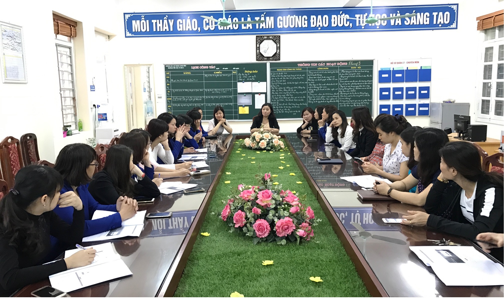 Sau đợt tập huấn ngày 01/3/2017 do Sở giáo dục và đào tạo Hà Nội tổ chức, Ban giám hiệu nhà trường đã triển khai áp dụng thí điểm phần mềm quản lí kết quả giáo dục tiểu học trong nhà trường theo đúng kế hoạch chỉ đạo của SGD&ĐT và của PGD&ĐT. BGH đã ban hành quyết định thành lập Ban quản trị phần mềm Quản lí kết quả giáo dục của nhà trường, cài đặt phần mềm Esams, tạo tài khoản cho GV và tập huấn cho 100% GV trong trường. Với thuận lợi là một trong những đơn vị đầu tiên của quận Long Biên và cũng là đầu tiên của Thành phố thực hiện thí điểm mô hình Trường học điện tử, hệ thống máy tính được UBND quận đầu tư, đường truyền tốt, Giáo viên có trình độ về CNTT. Tham gia thí điểm đợt này là 10 đ/c GVCN (Mỗi khối 2 lớp):