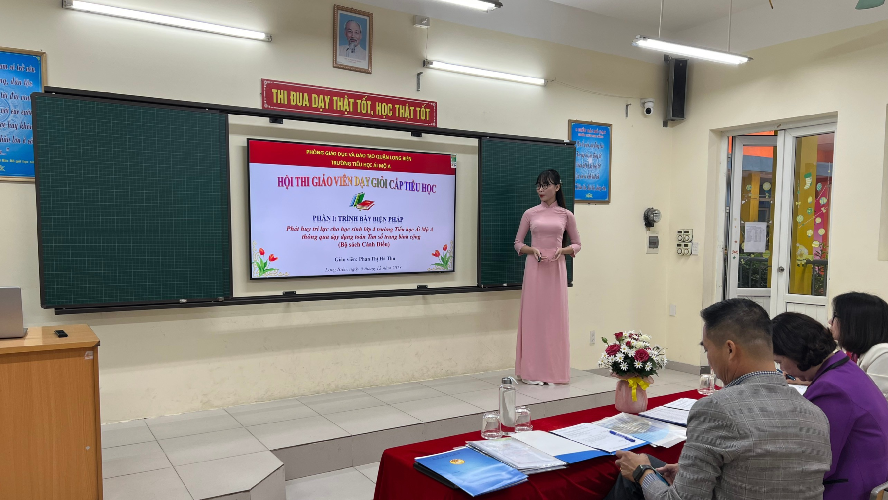 Thực hiện theo kế hoạch số 25/KH –PGDĐT của Phòng Giáo dục và Đào tạo Long Biên, với mục đích phát hiện, công nhận, tôn vinh giáo viên đạt danh hiệu giáo viên dạy giỏi và nhân rộng những điển hình tiên tiến, tạo động lực cho giáo viên phấn đấu, hoàn thiện bản thân, góp phần nâng cao hiệu quả sinh hoạt chuyên môn, trường Tiểu học Ái Mộ A đã tổ chức Hội thi cấp trường ngay từ đầu tháng 10 và chọn ra được 2 cô giáo tiêu biểu. Đó là cô Nguyễn Thị Thu Lan (giáo viên lớp 3C) và cô Phan Thị Hà Thu (giáo viên lớp 4E). Nhờ có sự nhiệt tình của tuổi trẻ, tâm huyết với nghề giáo cùng quyết tâm phấn đấu, hoàn thiện bản thân, cô giáo Phan Thị Hà Thu đã được tin tưởng và lựa chọn tham gia dự thi Hội thi Giáo viên dạy giỏi cấp Quận năm học 2023 – 2024.