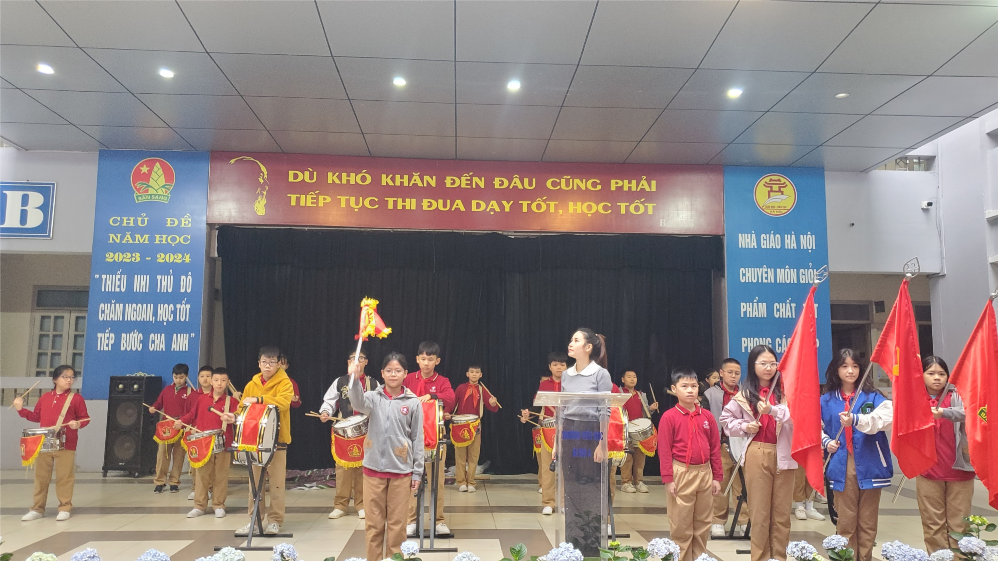 Sau phần nghi lễ, cô giáo Phạm Thị Khánh Ninh – Bí thư chi bộ - Hiệu trưởng nhà trường đã dành những lời chúc tốt đẹp đến các bạn học sinh cùng gia đình.