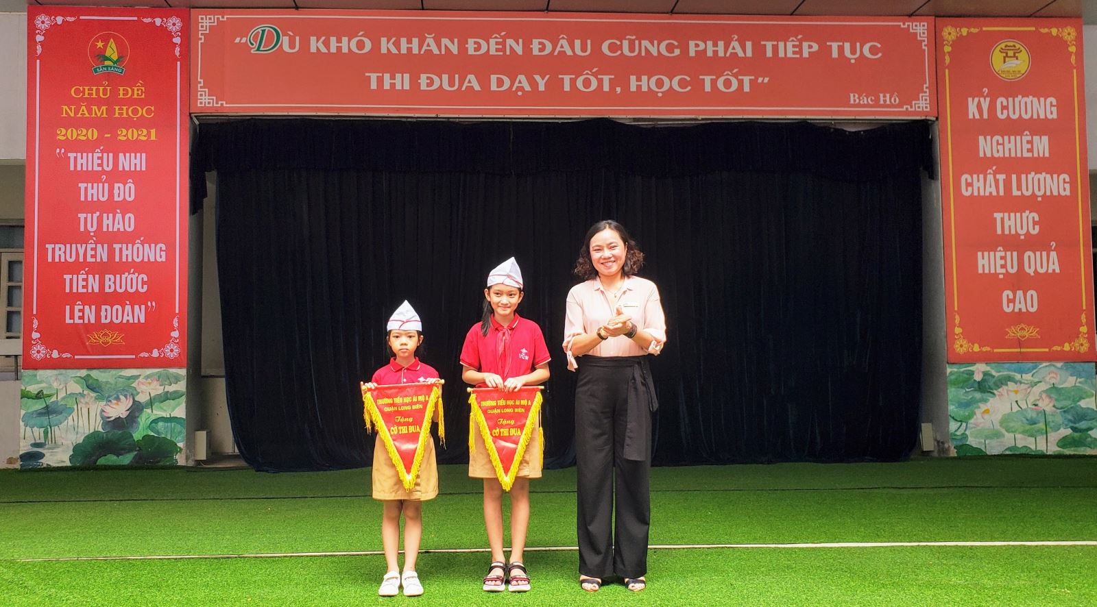 Cô Nguyễn Thị Bích Huyền trao cờ thi đua cho hai lớp 2C và 4D