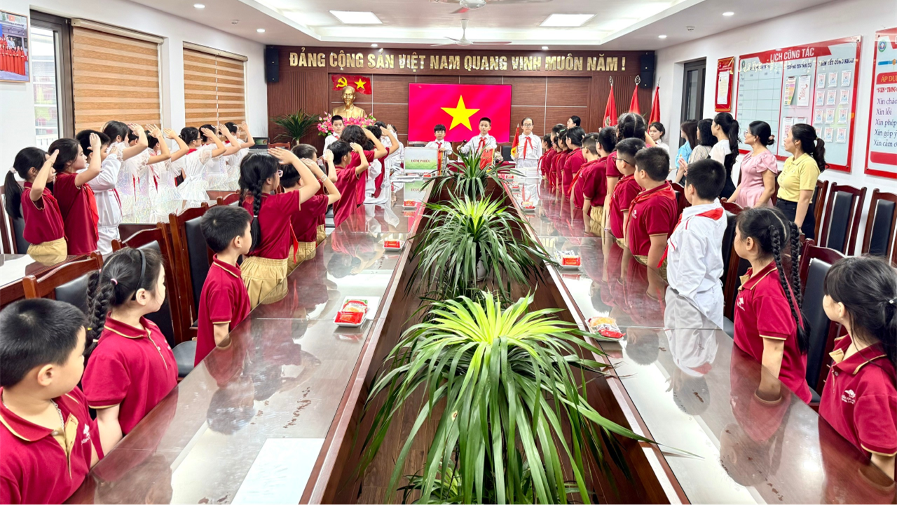 Đại hội vinh dự được đón tiếp cô Thái Thu Huyền - Phó Bí thư Chi bộ, Phó Hiệu trưởng nhà trường; cô Ngô Mai Vi - Tổng phụ trách Đội cùng đại diện các Chi đội và 50 đội viên ưu tú - những bông hoa tiêu biểu đại diện cho 234 đội viên trong toàn trường.
