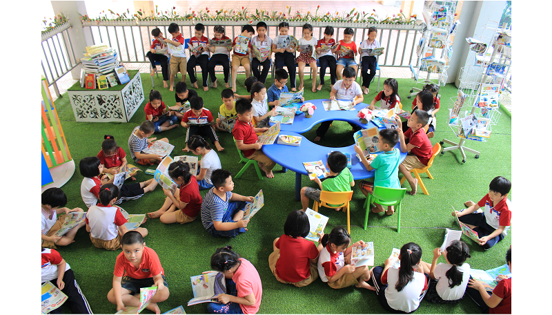 Các bạn nhỏ lớp 2C chăm chú đọc những trang báo tại thư viện mở của nhà trường