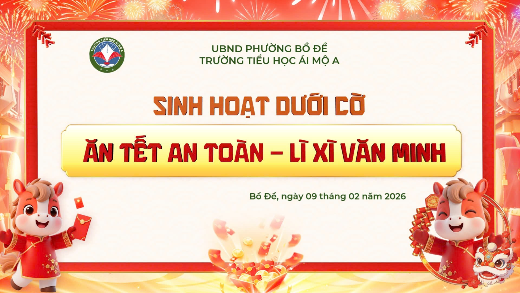 Trong không khí năm mới đang đến gần, Trường Tiểu học Ái Mộ A kính chúc quý phụ huynh, các thầy cô giáo và toàn thể các em học sinh một năm mới an khang - mạnh khỏe - bình an. Chúc các em học sinh đón Tết trong niềm vui trọn vẹn, để mùa xuân thực sự là mùa của sự sống, của yêu thương và những giá trị tốt đẹp được gieo trồng từ hôm nay.