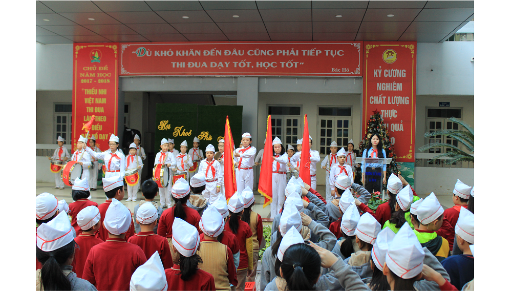 Sau phần nghi lễ,các bạn học sinh đã được nghe nhận xét thi đua trong đợt 2 và các nội dung thi đua đợt 3 từ cô giáo Tổng phụ trách Phương Anh. Chủ đề của đợt thi đua này với nội dung Tiếp bước cha anh tập trung vào các hoạt động tìm hiểu về truyền thống anh bộ đội Cụ Hồ với các hoạt động như: học giới thiệu về 1 tấm gương anh hùng qua các thời kỳ kháng chiến trong giờ chào cờ đầu tuần, tặng quà cho các chú bộ đội biên giới, viết thư gửi chú bộ đội , vẽ tranh về chú bộ đội, Tìm hiểu chiến thắng Điện Biên Phủ trên không của quân dân Hà Nội, Thăm và tặng quà đơn vị kết nghĩa nhân ngày 22/12, Hưởng ứng tháng hành động quốc gia phòng chống HIV/AIDS và quyên góp gây quỹ hỗ trợ trẻ em, người nhiễm HIV/AIDS có hoàn cảnh khó khăn, Tập trung ôn tập tốt để hoàn thành chương trình học kì 1…..Rất nhiều các nội dung thi đua phong phú theo chủ đề được Liên đội tổ chức từ ngày 21/11 đến 22/12. Trong tuần thi đua thứ 13, hai tập thể lớp 3D và 4C đã xuất sắc xếp thứ nhất và được nhận cờ thi đua từ cô Nguyễn Thị Bích Huyền – Hiệu trưởng nhà trường trao tặng.