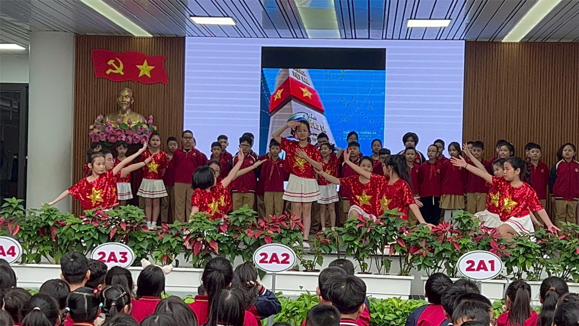 Tiếp nối không khí sôi động, các em học sinh lớp 4A2 đã mang đến hai tiết mục đặc sắc: một màn nhảy "Khát vọng tuổi trẻ" đầy nhiệt huyết và một tiết mục múa hát "Chú bộ đội ngoài đảo xa" đầy xúc động. Mỗi điệu múa, mỗi lời ca đều thấm đượm sự nhiệt tình và lòng tự hào, khiến không khí lễ hội thêm phần rộn rã, dâng trào trong những tràng vỗ tay không ngớt từ các bạn học sinh.