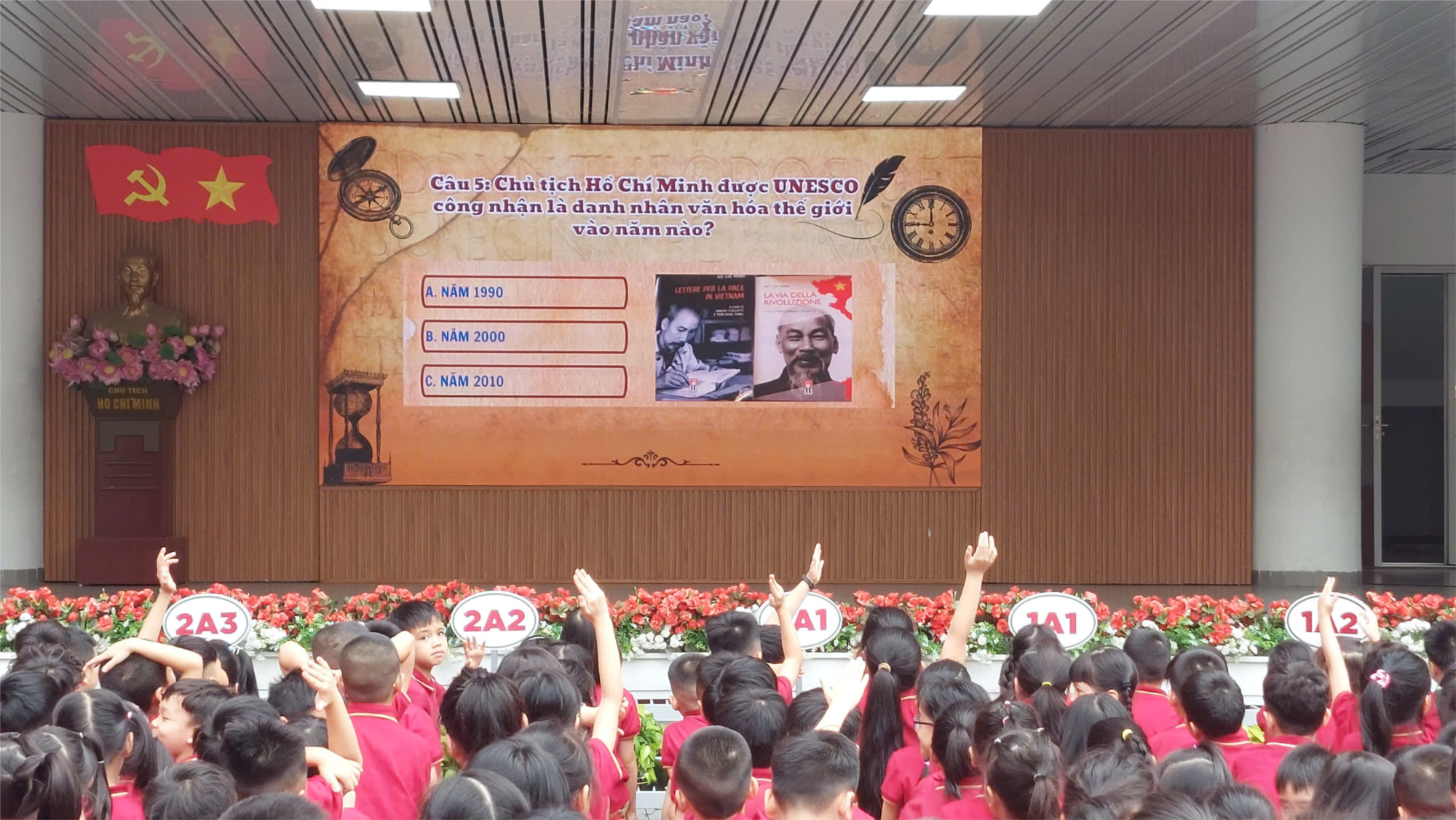 Không chỉ vậy, các bạn học sinh toàn trường còn được giao lưu tham gia trả lời các câu hỏi tìm hiểu về Bác Hồ kính yêu như Bác Hồ sinh ngày tháng năm nào, tên khai sinh của Bác là gì? Bác Hồ ra đi tìm đường cứu nước vào ngày tháng năm nào, tại đâu, trong thời gian bao lâu? Bác Hồ được tổ chức UNESCO công nhận là danh nhân văn hóa thế giới vào năm nào?… Qua từng thước phim, đoạn Video, câu hỏi các em học sinh có thêm những kiến thức quý báu về vị lãnh tụ Hồ Chí Minh, lớp lớp thiếu niên nhi đồng trường Tiểu học Ái Mộ A càng thêm kính trọng và biết ơn công lao to lớn của Người với dân tộc Việt Nam.