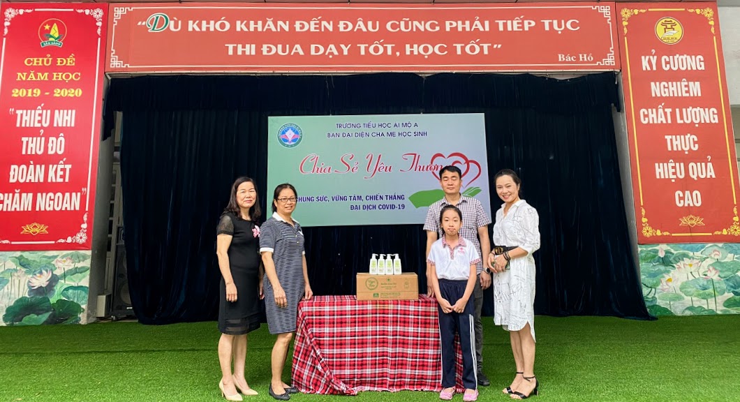 Ông Nguyễn Minh Nam - Phụ huynh học sinh Nguyễn Trâm Anh, lớp 3C đã trao tặng một thùng nước rửa tay sát khuẩn cho thầy và trò trường Tiểu học Ái Mộ A.