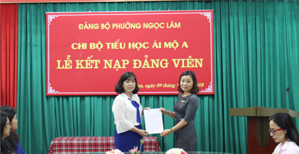 Lễ kết nạp được diễn ra trong không khí trang nghiêm, đúng trình tự, thủ tục kết nạp đảng viên mới. Tại buổi Lễ, đồng chí Nguyễn Thị Bích Huyền – Bí thư Chi bộ Trường TH Ái Mộ A đã trao quyết định kết nạp và phân công nhiệm vụ cho đảng viên mới Nguyễn Thu Hồng; đồng thời phân công các đồng chí đảng viên chính thức trong chi bộ tiếp tục giúp đỡ, dìu dắt đồng chí trong thời gian thử thách 12 tháng.