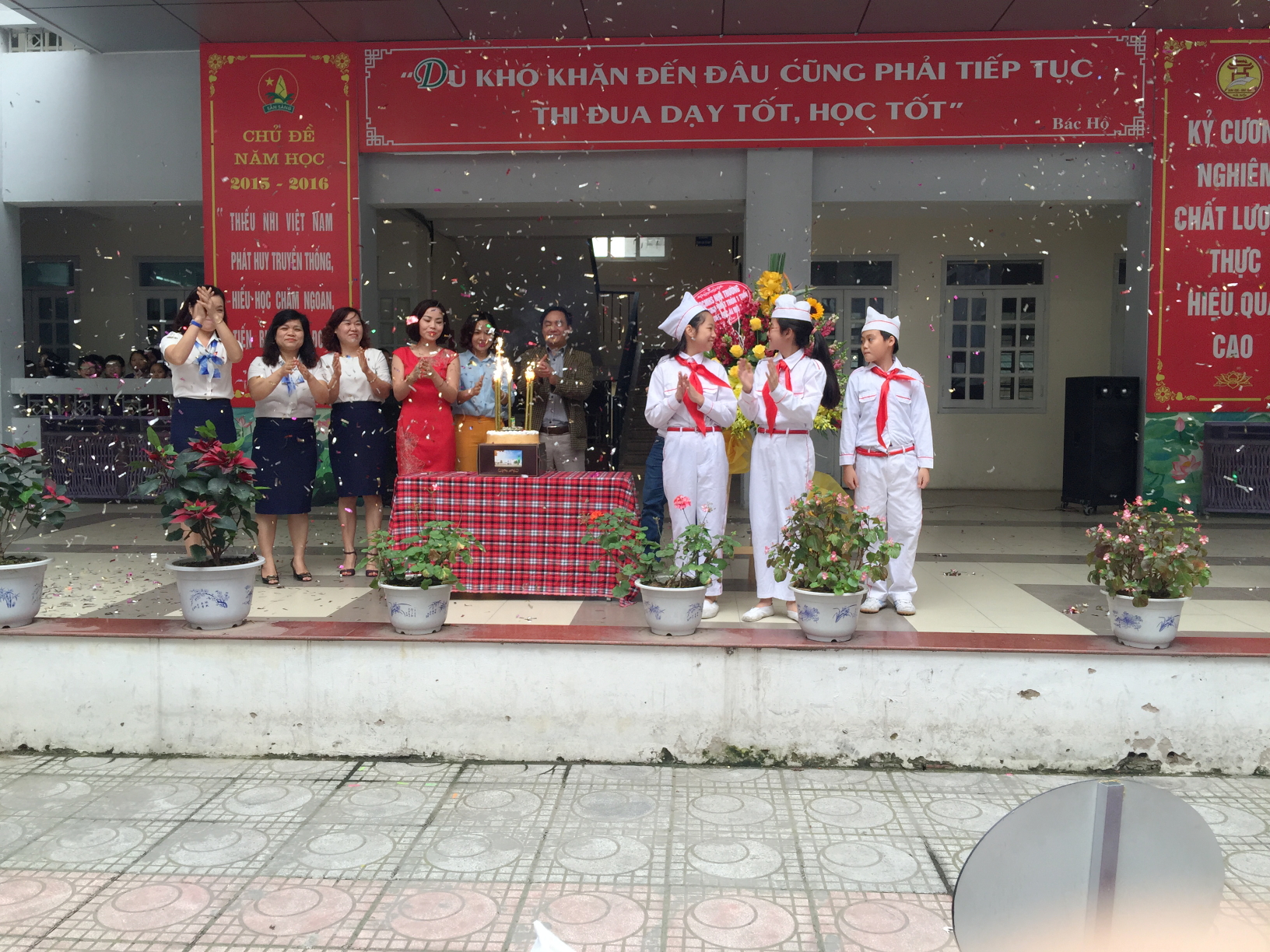 Ngày hôm nay là một ngày hội lớn, sân trường trở nên rực rỡ hơn với hoa, với tiếng cười, với lời chúc, với khuôn mặt vui tươi rạng rỡ của các bạn học sinh. Sau những giây phút trang nghiêm mà vô cùng xúc động với diễn văn chào mừng kỉ niệm một năm thành lập trường của cô Nguyễn Thị Bích Huyền – BTCB – HT nhà trường, sân khấu bừng lên rộn rã bởi những tiết mục văn nghệ đặc sắc của tập thể các thầy giáo, cô giáo, các em học sinh. Ban đại diện CMHS nhà trường đã gửi bó hoa tươi thắm, những lời chúc tốt đẹp nhất đến cô trò Ái Mộ A.