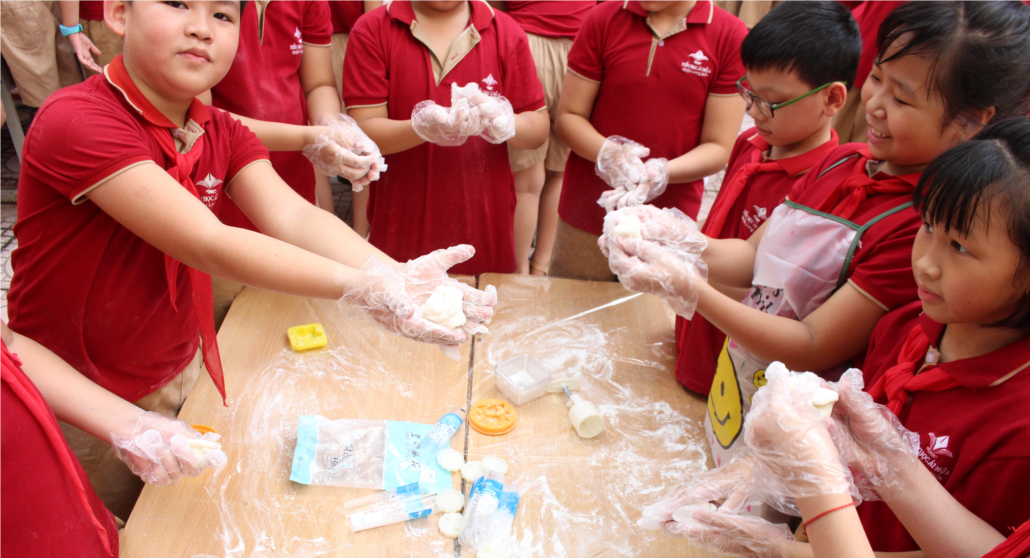 Sau đó, mỗi nhóm học sinh được phát bột, các em thực hiện nhào bột và cho bột vào khuôn. Tất cả các em đều hứng thú khi được tự tay mình tạo nên những chiếc bánh dẻo vừa ngon, vừa sạch lại vừa đẹp. Các cô giáo chủ nhiệm của mỗi lớp cùng thầy Quang và cô Bích Huyền đã đến từng nhóm chỉ dạy, hướng dẫn. Sau khi mỗi bạn hoàn thành sản phẩm của mình, các em đặt bánh vào hộp nhựa nhỏ và để vào túi nhỏ rất xinh xắn. Sản phẩm của các em trông thật giống với sản phẩm được trưng bày tại quầy bánh Trung thu. Các bạn nhỏ trường Tiểu học Ái Mộ A thật khéo tay phải không nào?