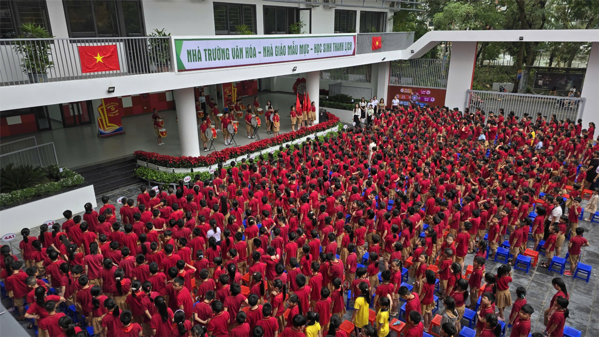 Khi tiếng nhạc của bài hát "Việt Nam ơi!" cất lên, tất cả học sinh cùng nhau xuống sân trường, đứng ngay ngắn vào hàng của từng khu vực lớp. Nghi lễ chào cờ đã được thực hiện một cách trang nghiêm. Các em cùng đáp vang chủ đề năm học: "Thiếu nhi Việt Nam-Vâng lời Bác dạy-Tự hào truyền thống-Tiếp bước cha anh".