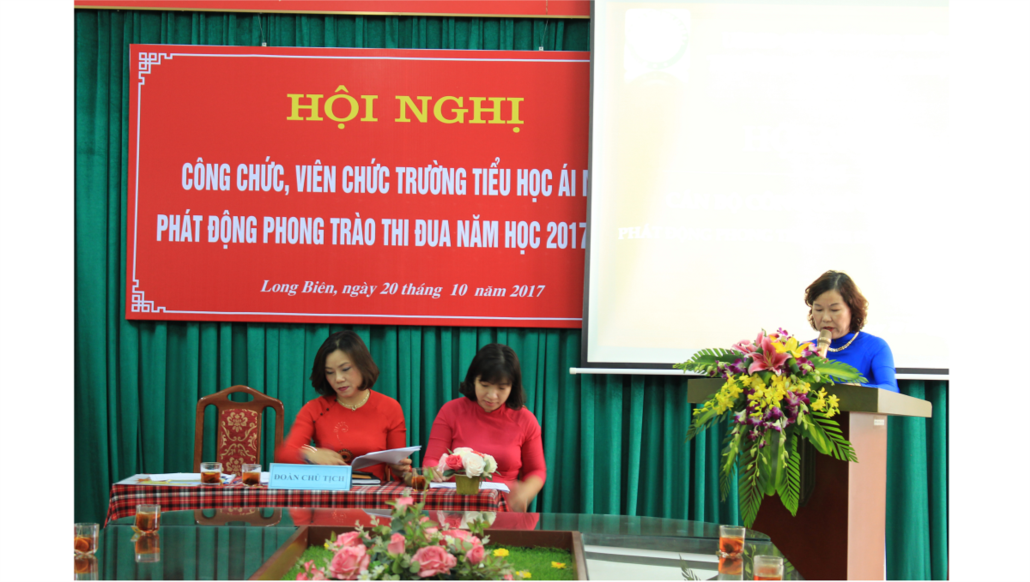 Ngày tổ chức hội nghị CB-CC –VC của trường Tiểu học Ái mộ A cũng là một ngày đặc biệt trong năm, ngày 20/10. 87 năm qua Tổ chức Phụ nữ Liên hiệp Hội ngày càng lớn mạnh, người phụ nữ Việt Nam yêu nước ngày càng có tri thức, có sức khoẻ, càng năng động, sáng tạo, có lối sống văn hoá, có lòng nhân hậu, quan tâm tới lợi ích xã hội và cộng đồng. Trải qua nhiều thăng trầm của xã hội, chị em luôn luôn thể hiện vai trò tích cực, đảm đang, với tấm lòng nhân hậu đã đóng góp nhiều công sức cho sự nghiệp giải phóng dân tộc, giành độc lập cho đất nước. Đóng góp một phần công sức vào những thành tựu đó phải kể đến các thê hệ các cô giáo của trường Tiểu học Ái Mộ A trong quá trình xây dựng nhà trường, đào tạo các thế hệ học sinh chăm ngoan, học giỏi và là tương lai của đất nước. Đồng chí Phùng Thị Hoa Thơm – Chủ tịch công đoàn nhà trường đã phát biểu khẳng định những thành quả đó và chúc mừng các chị em nữ của nhà trường nhân ngày đặc biệt này.