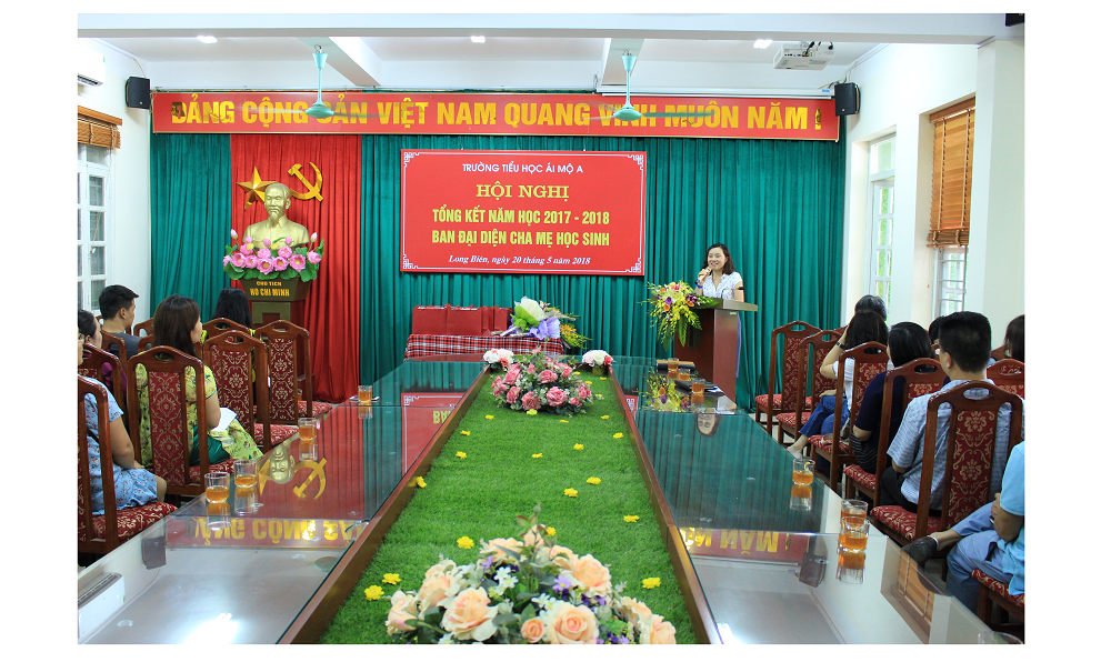 Tại hội nghị, cô giáo Hiệu trưởng Nguyễn Thị Bích Huyền đã đọc báo cáo tổng kết năm học. Năm học 2017 – 2018 tiếp tục là năm học gặt hái nhiều thành công với cả Thầy và Trò trường Tiểu học Ái Mộ A. Cô Hiệu trưởng khẳng định với các thế mạnh:
