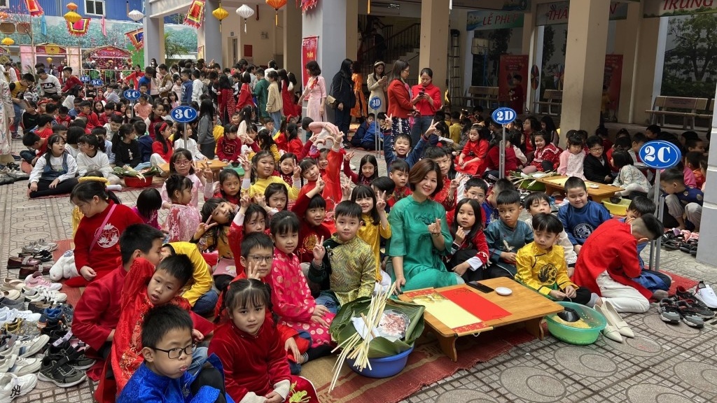 Cá !important;c hoạt động như tái hiện không gian phiên chợ xưa, gói bánh chưng, viết thư pháp, trang trí cành đào… đã mang đến nhiều trải nghiệm thú vị cho các em học sinh cảm nhận rõ nét hơn về Tết xưa cổ truyền.