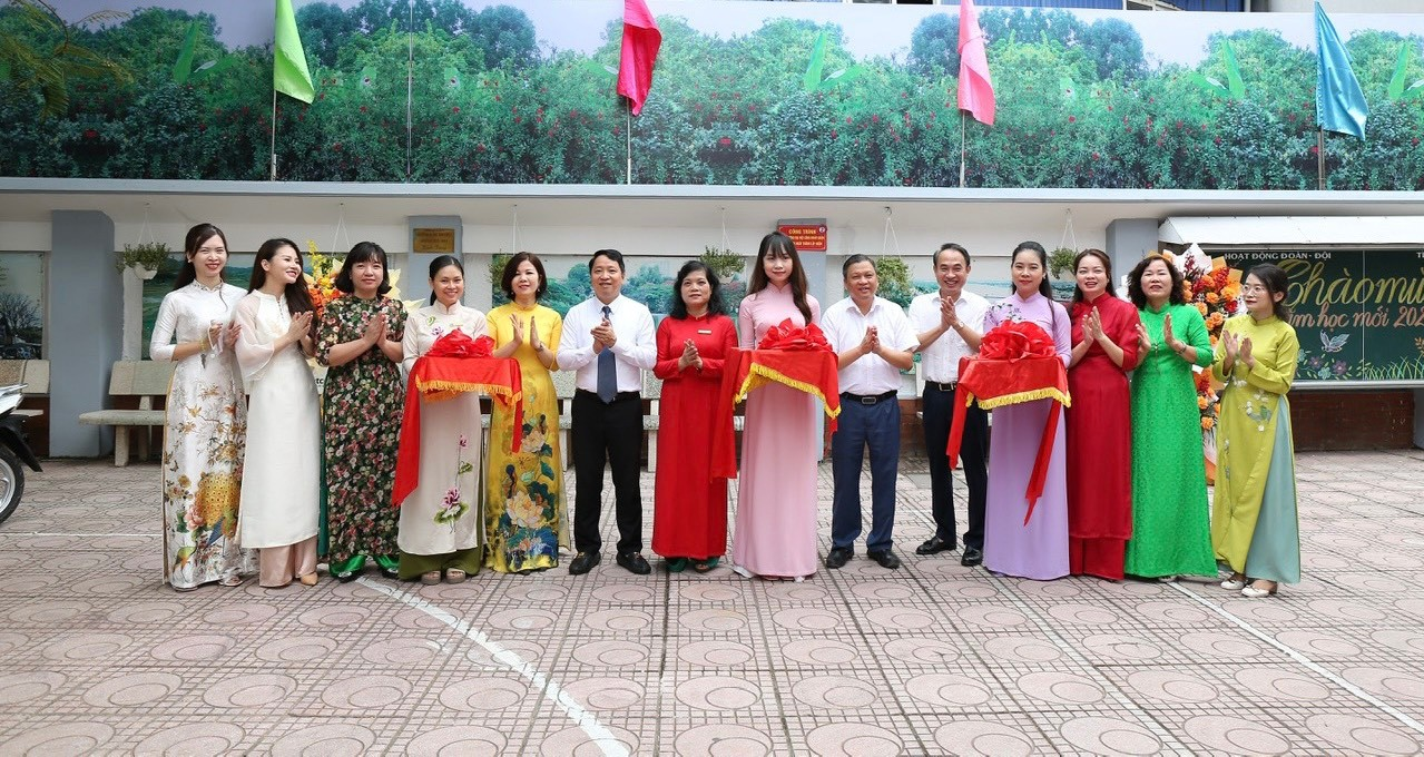 Đồng chí Nguyễn Huy Hoàng - Quận uỷ viên, Chánh thanh tra quận Long Biên, đồng chí Vũ Ngọc Hiệp - Phó Bí thư Đảng uỷ, Chủ tịch UBND phường Ngọc Lâm, cùng BĐ D CMHS và Liên tịch nhà trường dự cắt băng khánh thành công trình kỉ niệm 20 năm thành lập quận Long Biên của Công đoàn trường TH Ái Mộ A