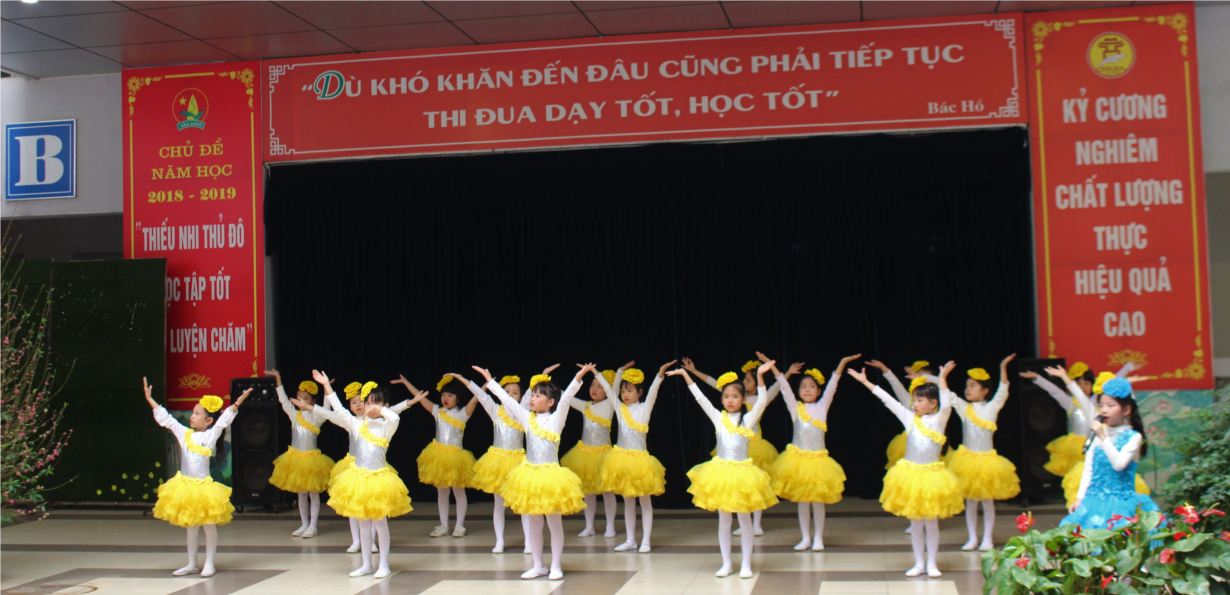 Tập thể lớp 2D thật đẹp với bài hát “Thương lắm thầy cô ơi”. Từng cánh tay nhịp nhàng theo lời hát thể hiện sự điêu luyện của các “nghệ sĩ nhí”. Bài hát “Mùa xuân vui hát cùng em” của các bạn nhỏ lớp 1A càng làm tăng thêm không khí vui vẻ của mùa xuân với những câu hát rộn ràng : Ô kìa mùa xuân, mùa xuân mùa xuân đẹp quá!Vui cùng mùa xuân cầm tay em múa em ca. Đất trời vào xuân mừng em được thêm tuổi mới. Chim hót reo vui ngàn hoa cũng hé môi cười!