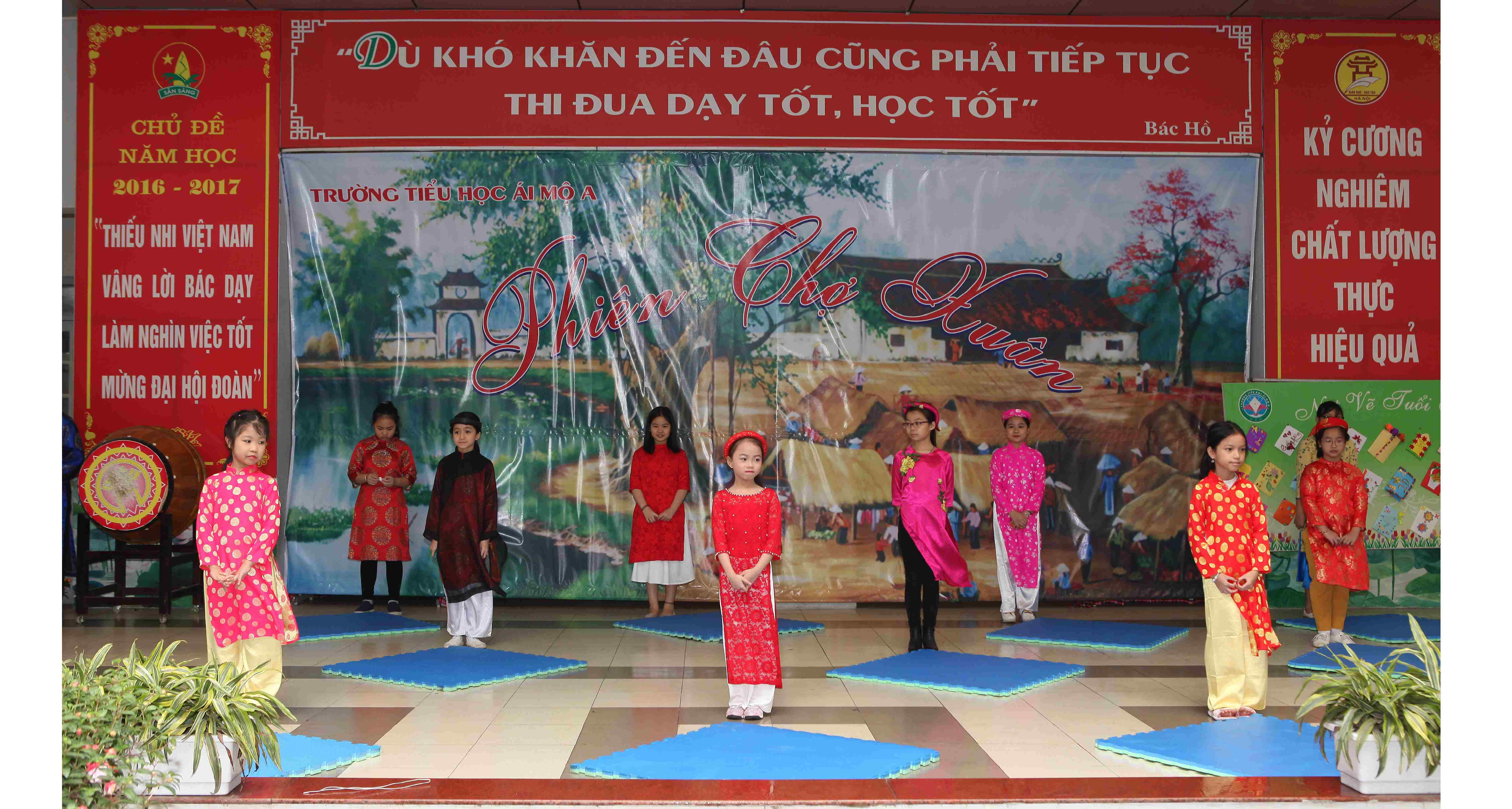 Sáng ngày 5/3/2017, Mưa lất phất mang lại một không khí rất xuân cho ngôi trường Tiểu học Ái Mộ A. Nhưng trời đấtt như chiều lòng người, đến trước giờ tổ chức, trời tạnh ráo và sáng dần. Sắc màu rực rỡ của bóng bay, màu đỏ của của câu đối, của những bông hoa chuối, màu xanh của bánh chưng, bánh tét… làm sắc xuân của phiên chợ Xuân thêm phần tươi thắm. Các bạn học sinh trong trang phục truyền thống rạng rỡ cùng đến trường với bố mẹ từ rất sớm để tham quan các gian hàng.