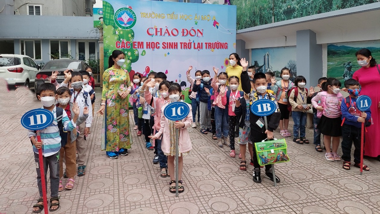 Ngay từ sáng sớm, ngôi trường như bừng tỉnh bởi âm thanh tươi vui náo nức của những bài hát thiếu nhi rộn ràng. Thấp thoáng những tà áo dài duyên dáng của các cô giáo thân thương. Trông các cô dường như ai cũng tươi trẻ hơn mọi ngày. Các bạn học sinh đến sớm nhanh chóng rời khỏi xe của bố mẹ, tự tin bước qua cánh cổng trường, được các thầy cô hướng dẫn đi qua khu vực sát khuẩn tay và đo nhiệt độ. Mấy bạn máy đo thật tài tình, chỉ cần đứng đúng vào chị trí là các bạn ấy đo được ngay nhiệt độ, rồi còn phun cả nước sát khuẩn ra nữa chứ. Ngộ nghĩnh ghê cơ. Lạ lẫm nhât vẫn là các cô cậu bé lớp 1, lần đầu tiên đến trường, tuy có hơi bỡ ngỡ chút nhưng mà không ai khóc nhè đâu khi rời xa tay nắm của ông bà cha mẹ, đã có các cô đến đón chúng mình rồi mà. Trong lớp, mọi thứ đều đã được thầy cô và bố mẹ chuẩn bị chu đáo, đầy đủ, sạch sẽ, thơm tho. Buổi học đầu tiên thật là hồi hộp nhưng cũng thật là hạnh phúc. Sau một thời gian dài phải học trực tuyến để phòng chống dịch, giờ thì các bạn đã có thể quay trở lại trường rồi. Chúng mình cùng nhau đi học đều, và cùng nhau thực hiện tốt các qui định phòng dịch nhé. Chúc các bạn và các thầy cô giáo của trường tiểu học Ái Mộ A hoàn thành nội dung chương trình giáo dục năm học 2021 – 2022 với thật nhiều sức khỏe và niềm vui.