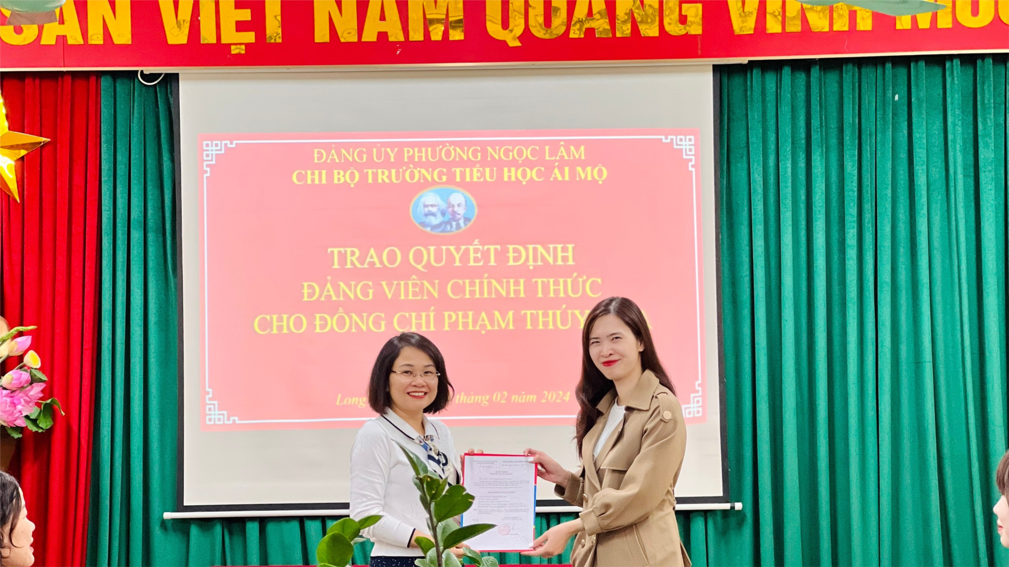 Cũng trong buổi sinh hoạt, Chi bộ đã trao Quyết định Đảng viên chính thức cho đồng chí Phạm Thuý Hoa, nâng tổng số đảng viên chính thức của chi bộ là 13 đồng chí. Trong thời gian tới, Chi bộ nhà trường sẽ tiếp tục bồi dưỡng các quần chúng tiêu biểu để kết nạp vào hàng ngũ Đảng, xây dựng đội ngũ Đảng viên vững mạnh, trong sạch.