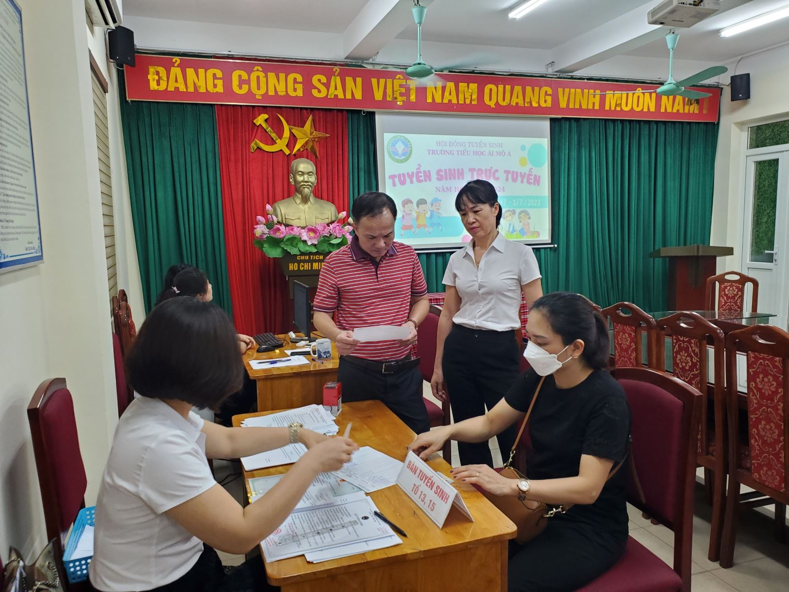 Trước ngày tuyển sinh trực tuyến, nhà trường đã chuẩn bị mọi điều kiện cần thiết về trang thiết bị công nghệ, đường truyền kết nối mạng, các thông tin hướng dẫn cha mẹ học sinh. 8h sáng ngày 01/07/2023, Hội đồng tuyển sinh trường Tiểu học Ái Mộ A đã có mặt ở phòng A204 –Phòng Hội đồng sư phạm nhà trường để hỗ trợ CMHS đăng kí trực tuyến và tiếp nhận hồ sơ. Nhờ việc công khai các văn về tuyển sinh trên trang website của nhà trường, tuyên truyền trong buổi họp PHHS cuối năm, có thông báo gửi các tổ dân phố và bài viết trên loa phóng thanh của phường từ trước ngày tuyển sinh nên trong ngày tuyển sinh trực tuyến, PHHS đều mang đủ hồ sơ, đúng diện tuyển sinh, tránh việc phải đi lại nhiều lần.