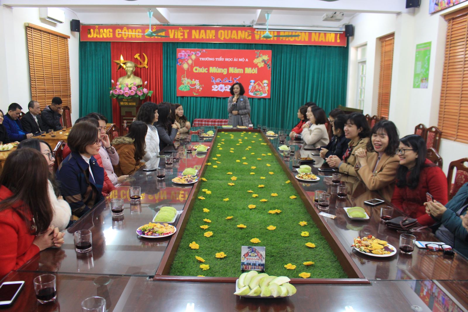Hơi thở mùa xuân đang lan dần khắp các ngõ phố, trên các con đường thân quen Hà Nội. Sắc vàng tươi của hoa mai, sắc hồng thắm của hoa đào, màu vàng bất tận của cánh đồng hoa cải nơi bãi giữa sông Hồng... và những hoài niệm khi lộc non hé nụ… Lại một năm mới nữa bắt đầu, một năm với bao hứa hẹn mới với trường Tiểu học Ái Mộ A nói riêng và với đất nước Việt Nam ta nói chung. Trong không khí vui tươi phấn khởi của Xuân Canh Tý 2020, giờ ra chơi của ngày học đầu tiên 30/01/2020 (tức mùng 6 Tết), trường Tiểu học Ái Mộ A tổ chức buổi gặp mặt đầu xuân mới tới toàn thể CB- GV- NV trong nhà trường. Đây là hoạt động thông lệ đầu năm của nhà trường với mong muốn trường bước vào một năm mới với những thành công mới. Chỉ 20 phút gặp mặt nhưng cũng đủ thấy không khí thân tình, đoàn kết, vui vẻ và ấm cúng.