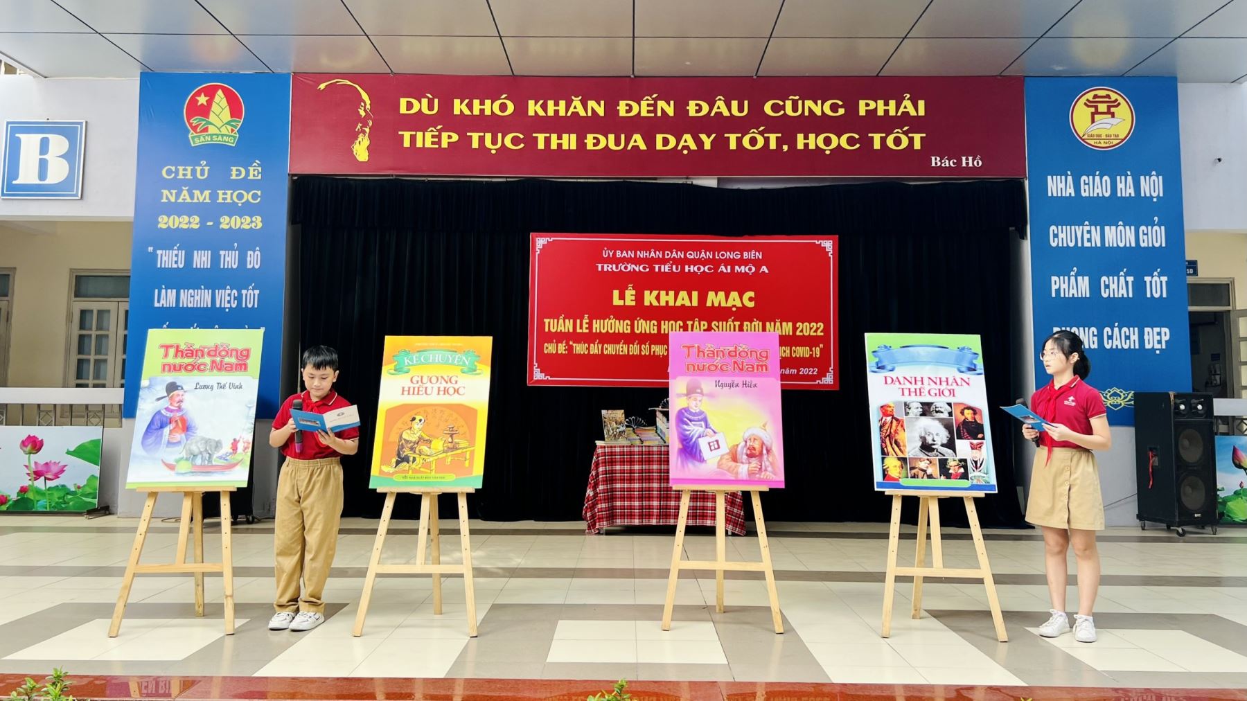 Tiếp sau đó là phần giới thiệu sách vô cùng hấp dẫn đến từ hai bạn học sinh Hải Phong và Hương Giang của lớp 5D. Bằng giọng kể cuốn hút và phong thái tự tin, hai bạn đã giới thiệu 3 cuốn sách: Thần đồng nước Nam, Gương hiếu học, Danh nhân thế giới. Cuối cùng là tiết mục hát múa “Ở trường cô dạy em thế” với nhịp điệu sôi động, tươi vui đến từ tốp ca lớp 5D.