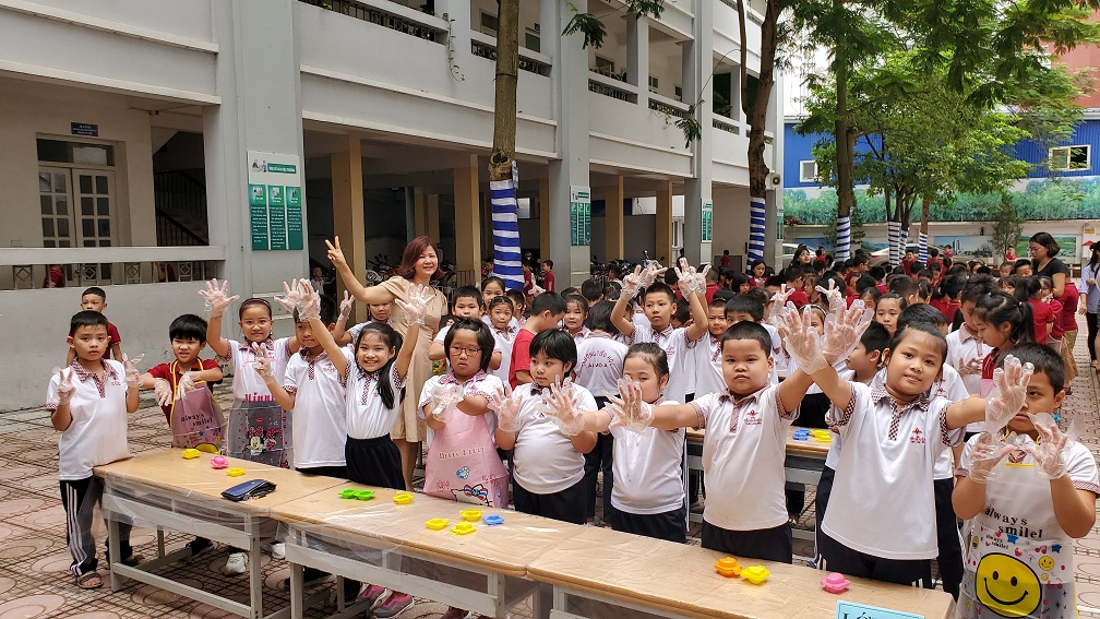 Tại các bàn làm bánh được kê sẵn, học sinh hồ hởi, phấn khởi đeo găng tay để bảo đảm an toàn vệ sinh trong quá rình làm bánh; nhiều con hoàn thành rất nhanh công việc của mình dưới sự hướng dẫn của các cô giáo.