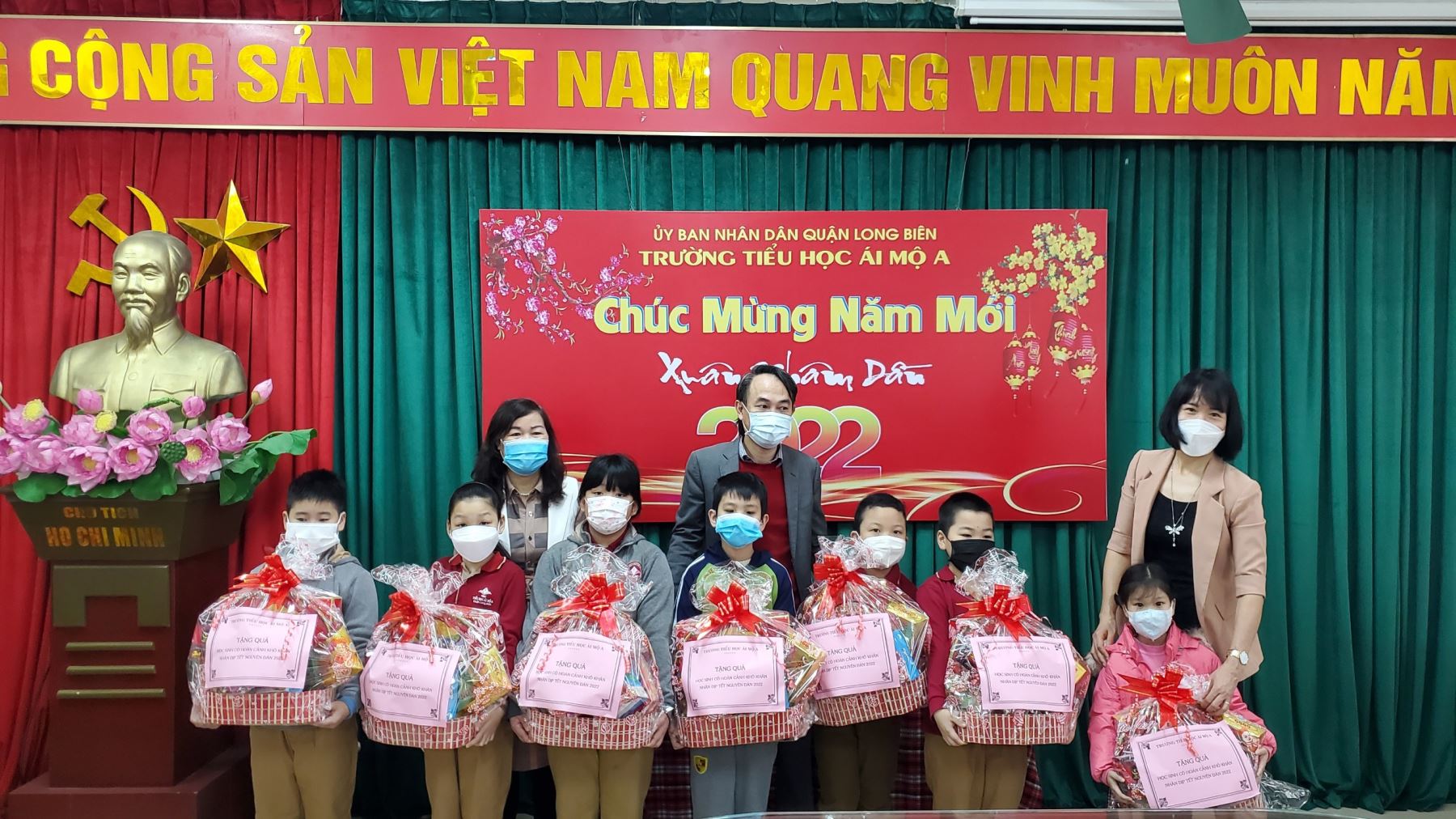 Đến dự với buồi lễ, về phía nhà trường có cô Bùi Thị Thu Hằng– Bí thư Chi bộ – hiệu trưởng nhà trường, cô Phùng Thị Hoa Thơm – chủ tịch Công đoàn và các thầy cô trong Liên tịch nhà trường. Về phía phụ huynh có các cô bác Đại diện CMHS nhà trường. Do tình hình dịch bệnh Covid 19 vẫn đang diễn biến phức tạp, để đảm bảo an toàn phòng chống dịch bệnh, nhà trường mời 7 học sinh thuộc hộ nghèo, có hoàn cảnh khó khăn đến tham dự và nhận quà.