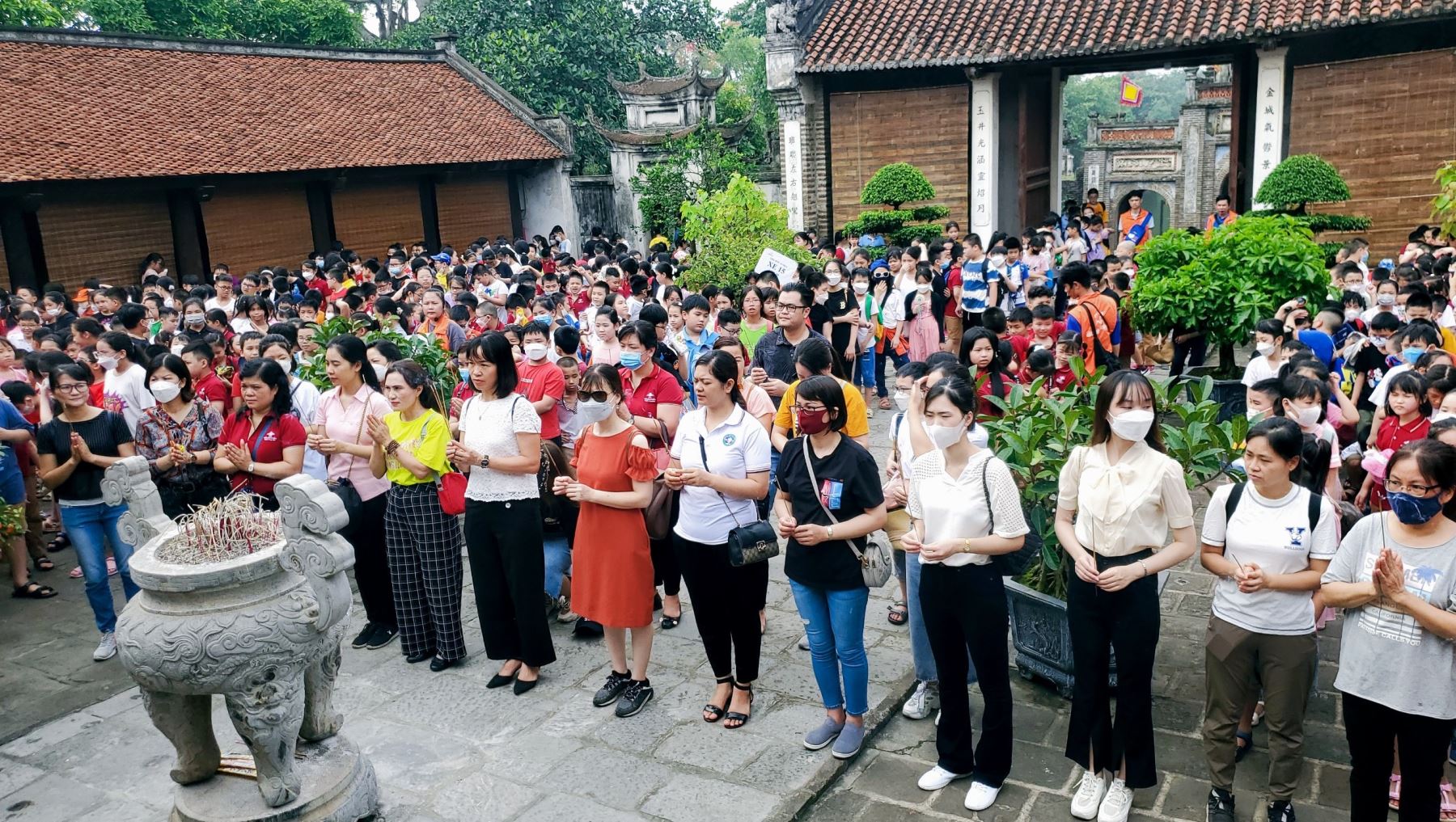 Quang cảnh giáo viên và học sinh đang dâng hương tại đền Cổ Loa