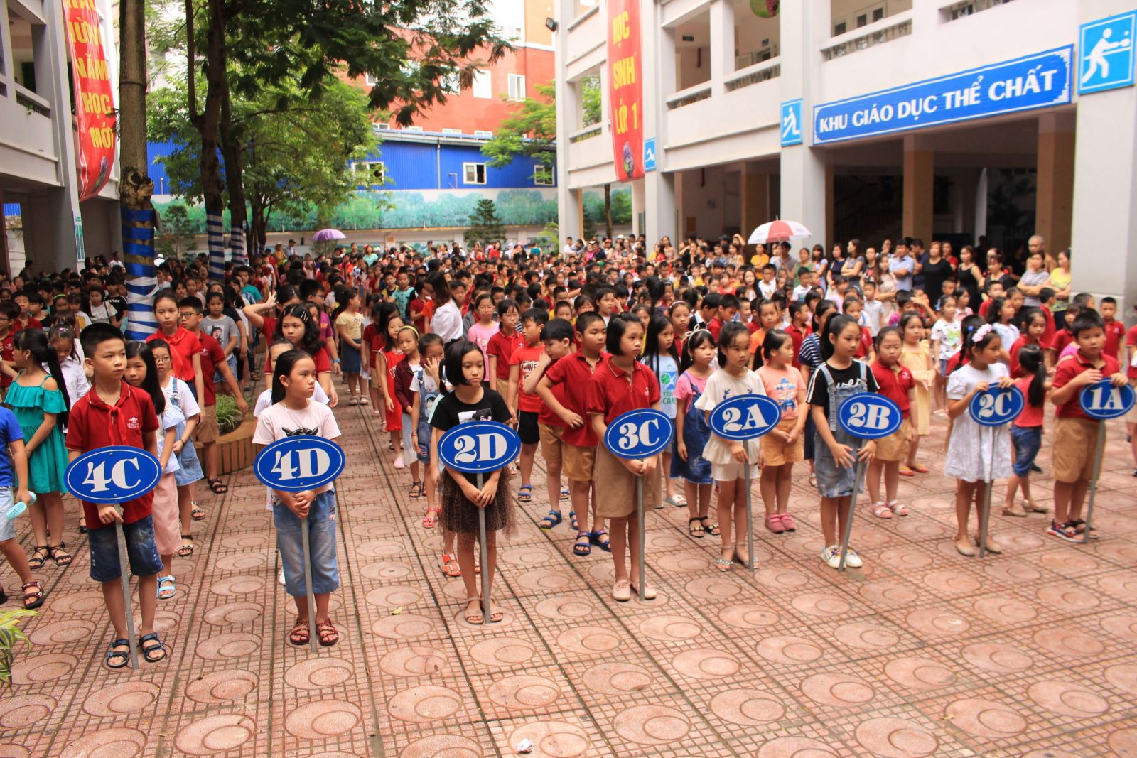 Đúng 8h00, sau hiệu lệnh tiếng trống trường quen thuộc, học sinh như đã thành thói quen, tập trung ngay ngắn dưới sân trường. Cô Nguyễn Thị Bích Huyền – Bí thư Chi bộ - Hiệu trưởng nhà trường thay mặt các thầy cô giáo chào đón các em học sinh trở lại ngôi trường tiểu học Ái Mộ A thân yêu. Cô hiệu trưởng đã giới thiệu cô giáo chủ nhiệm mới cho từng lớp trong năm học 2019 – 2020. Các bạn học sinh ai nấy đều phấn khởi, háo hức chào đón các thầy cô chủ nhiệm mới và chăm chú lắng nghe cô hiệu trưởng dặn dò.