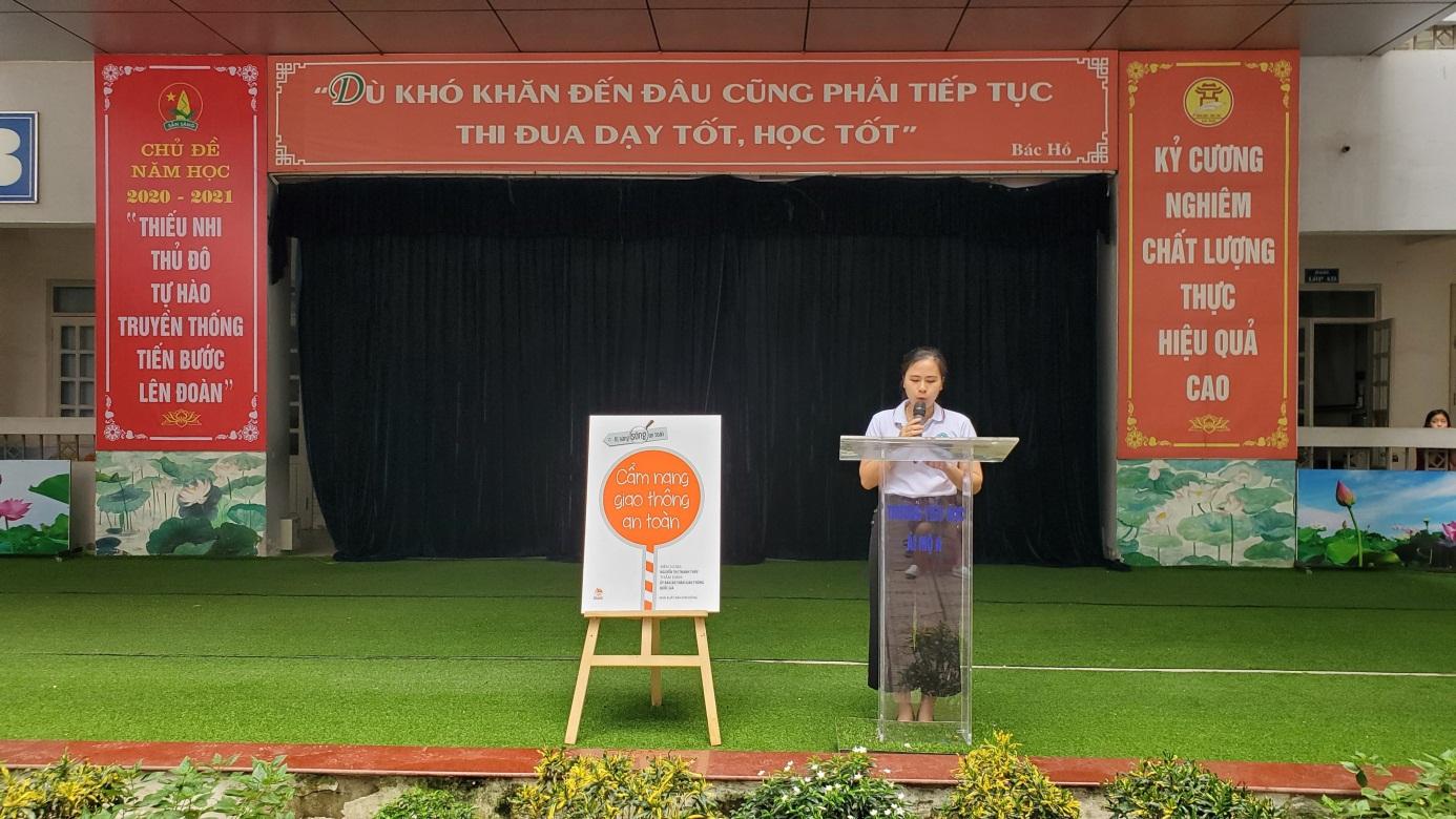 Hình ảnh cô Nguyễn Thị Thu Hiền giới thiệu sách hay tháng 9 trong tiết chào cờ