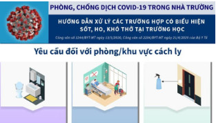 Các infographic về hướng dẫn xử lý các trường hợp có biểu hiện sốt, ho, khó thở tại trường học gồm: Phạm vi đối tượng áp dụng; các bước xử trí khi phát hiện người nghi ngờ; khai thác tiền sử tiếp xúc của người nghi ngờ và xử trí sau khi hỏi tiền sử tiếp xúc dịch tễ; yêu cầu đối với phòng, khu vực cách ly.
