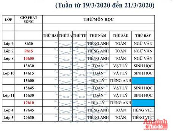 Đáng chú ý, từ thứ Năm, 19-3 tới, Đài Phát thanh và Truyền hình Hà Nội phối hợp với Sở GD&ĐT quyết định bổ sung thêm chương trình học qua truyền hình cho các lớp 4,5,6,7,8,10 và 11 trong bối cảnh học sinh vẫn đang tiếp tục nghỉ học để phòng dịch Covid – 19. Các lớp này sẽ học trên kênh 2 với lịch học cụ thể như sau.