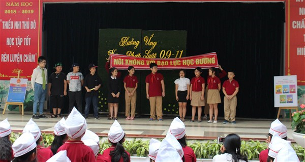 Để giúp các bạn học sinh có thêm kiến thức và kỹ năng phòng tránh bạo lực học đường, các bạn lớp 4C đã biểu diễn thành công tiểu phẩm đặc sắc: Bạo lực học đường - khôn lường tác hại. Với những lời thoại thông minh, dí dỏm, hài hước, các diễn viên nhí lớp 4C đã gửi tới các thầy cô và các bạn thông điệp cũng như quyết tâm của học sinh trường Tiểu học Ái Mộ A “Nói không với bạo lực học đường”. Kết thúc giờ chào cờ, kết thúc nội dung tuyên truyền về ngày pháp luật, cô và trò nhà trường còn được thưởng thức tiết mục múa dân gian đặc sắc do bạn Tường Nhi biểu diễn.